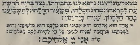 â"Mashiaj nuestra justicia ha sido desgarrado de nosotros. Estamos llenos de terror pues no hay quién nos justifique. El ha llevado el yugo de nuestras transgresiones y él ha sido herido por nuestros pecados. El sufre en su hombro el peso de nuestros pecados, encuentra Perdón para nuestras transgresiones. Somos sanados por sus heridas, por sus franjas. El es eternamente regenerado. Del círculo (de los gentiles) levántenlo, hagan que ascienda. (traigámoslo de regreso). Traigámoslo a casa. Del Monte Seir (referencia a Roma) libérenlo. Que él pueda ser escuchado desde el Monte de Líbano. Por una segunda vez, por la mano de Yinon (nombre secreto de Mashiaj)"